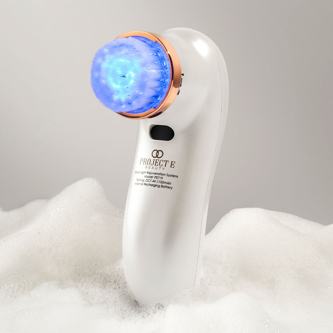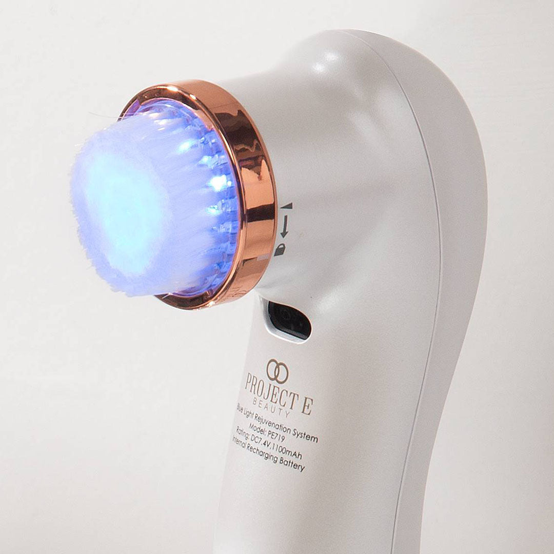 Acne-fighting blue light therapy combined with a battery-powered cleansing brush provides an intense purifying cleanse